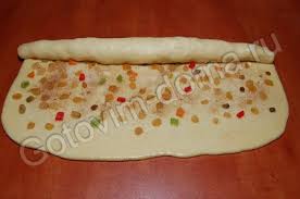 Равномерно распределить на тесте изюм, цукаты, посыпать сахаром, ванильным сахаром (по-желанию, можно посыпать корицей).